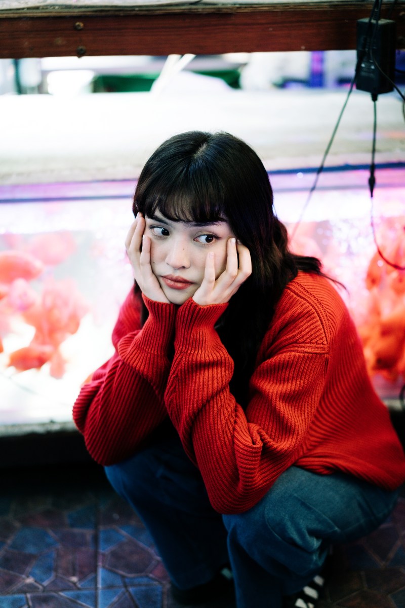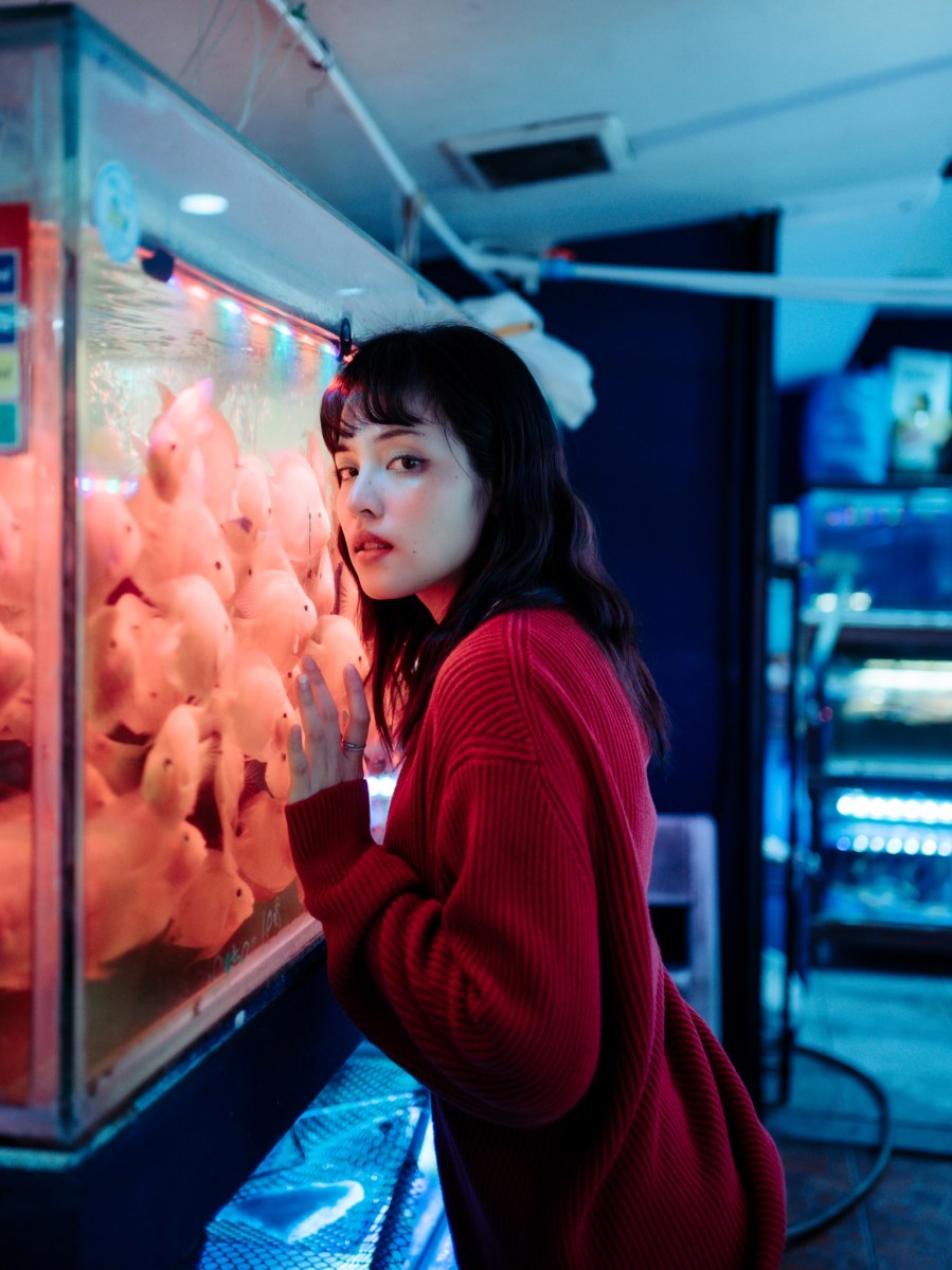 ในเรื่องของโทนสีของภาพ จุดแรกเราคุยกับนางแบบให้เตรียมเสื้อสีแดง หรือน้ำเงิน ขาว ดำ มาก็จะดี ซึ่งน้องก็จัดมาให้ครบทุกสีเลยค่ะ ประทับใจมาก แสงในร้านโดยรวมออกโทนเย็น แต่นางแบบใส่สีแดงซึ่งเป็นโทนร้อน นางแบบก็จะโดดเด่นขึ้นมาเลย ประกอบกับโทนสีในหัวของเราที่พยายามคุมโทน เราตั้งใจเก็บสีแดงไว้ให้ตรงที่สุด ไม่ทำให้อมส้ม หรือชมพู เพื่อจะได้เห็นเฉดสีแดงที่หลากหลาย ที่มีทั้งสีเสื้อและสีของน้องปลา และเราเลือกปรับสภาพแสงโดยรวมให้ออกโทนเย็น เลยได้ออกมาเป็นอย่างที่เห็นเลยค่ะ